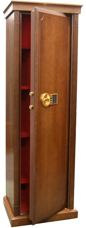— Внутренняя отделка – эффектный красный бархат, успешно оберегающий оружие от царапин. Снаружи – декоративная отделка натуральным деревом и шпоном дуба.
